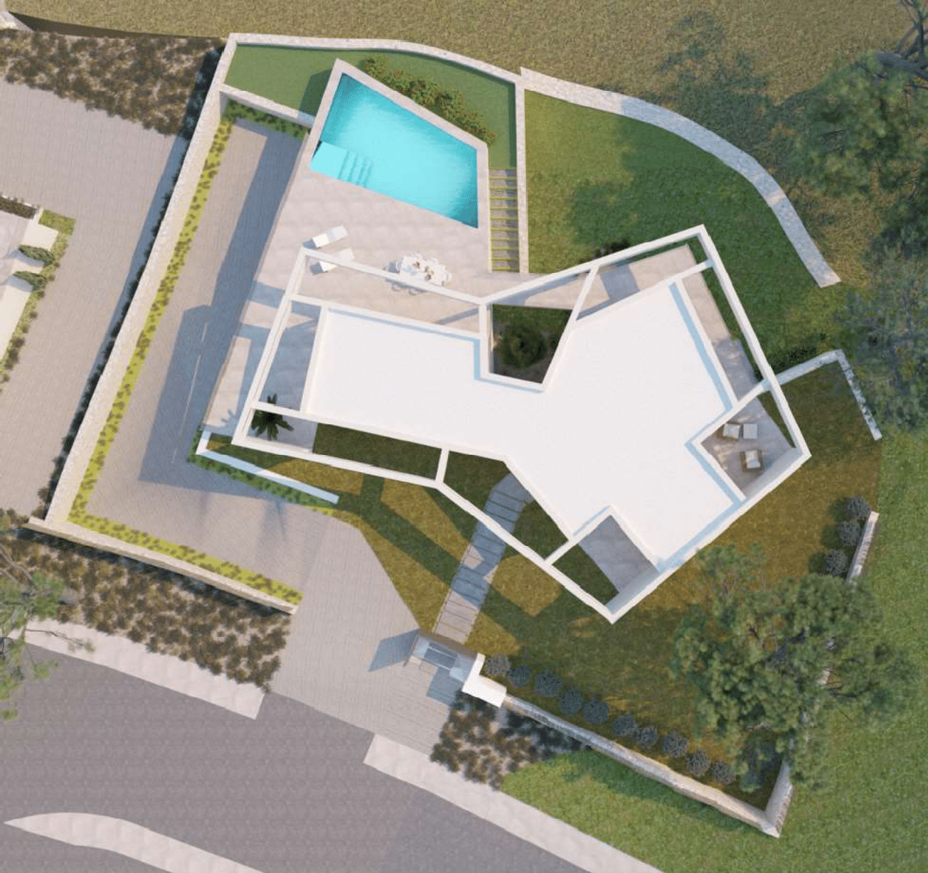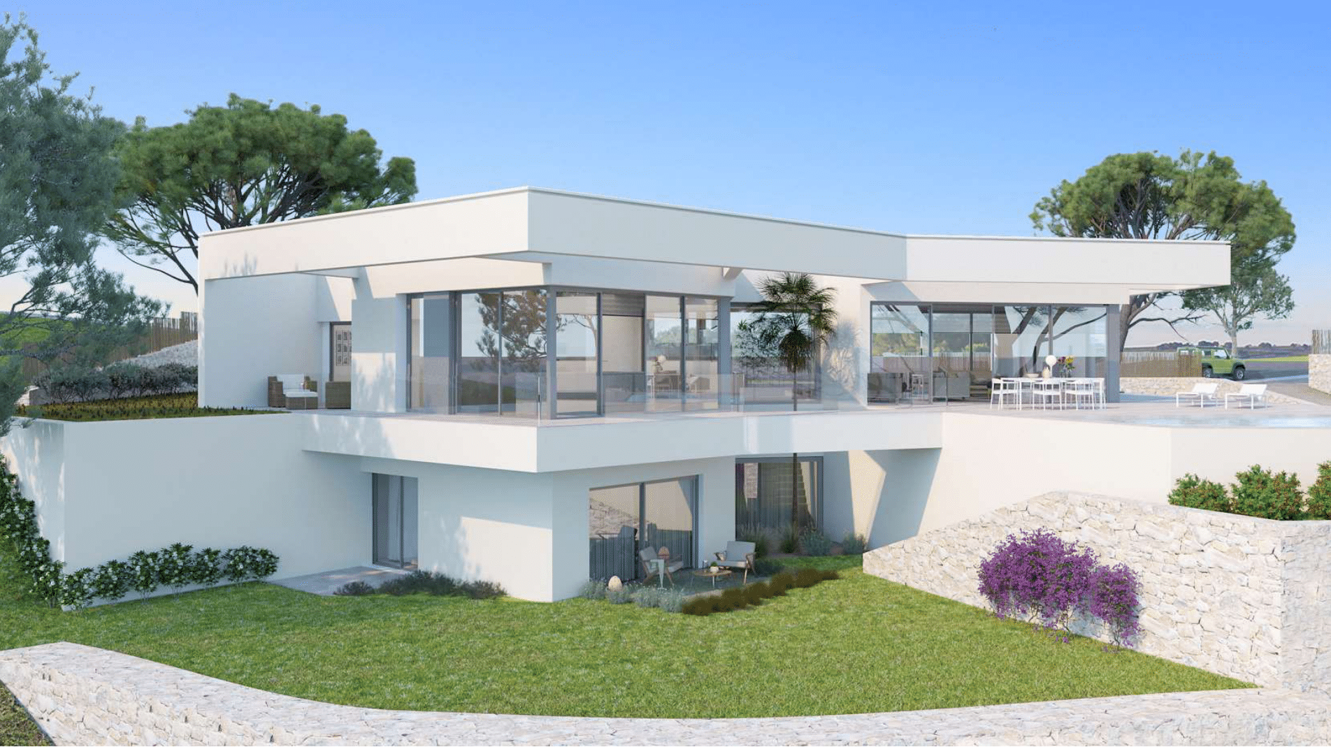 Large south facing detached off plan villa constructed with 3 bedrooms, 3+1 bathrooms, office, media / golf simulation room, private pool , terraces, garage and laundry room. Completion around 14 – 16 months from purchase. Roof solarium optional extra (this would offer amazing views, you could sit with a glass of wine watching the sun go down)