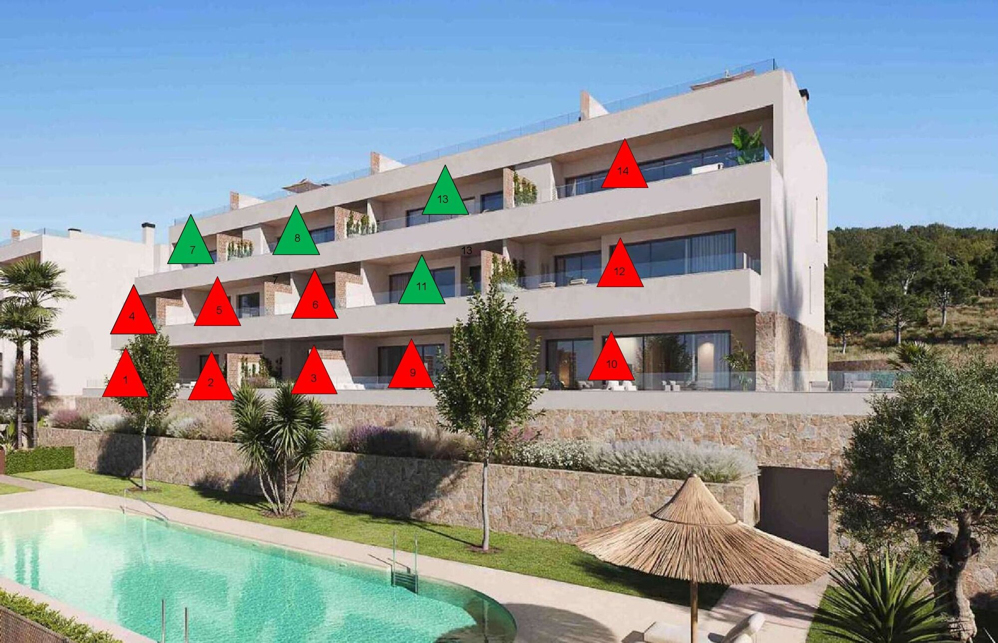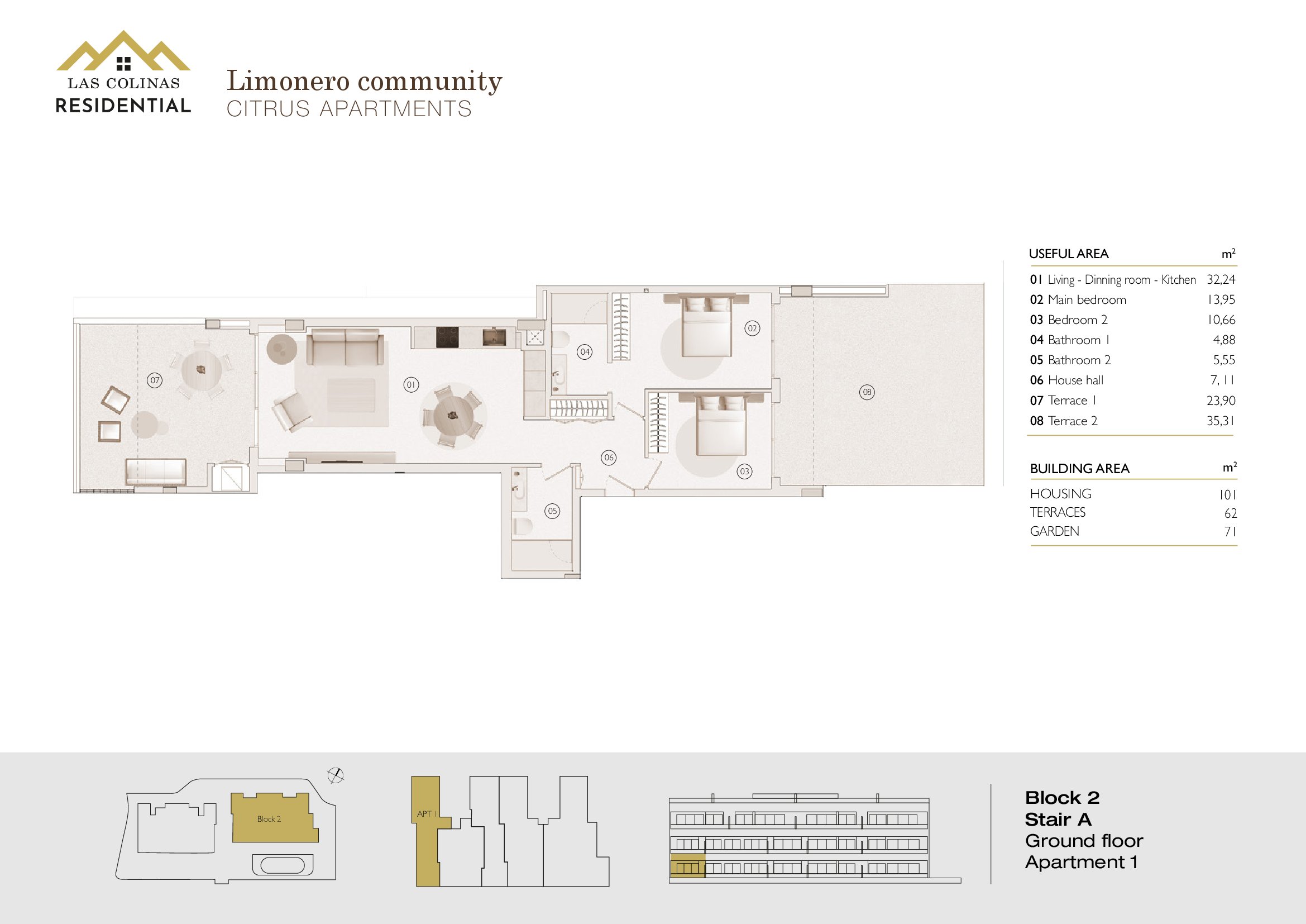 | No | Floor | Bed | Bath | Apt m² | Terrace m² | Garden m² | Roof m² | Total m² | Price € +iva |