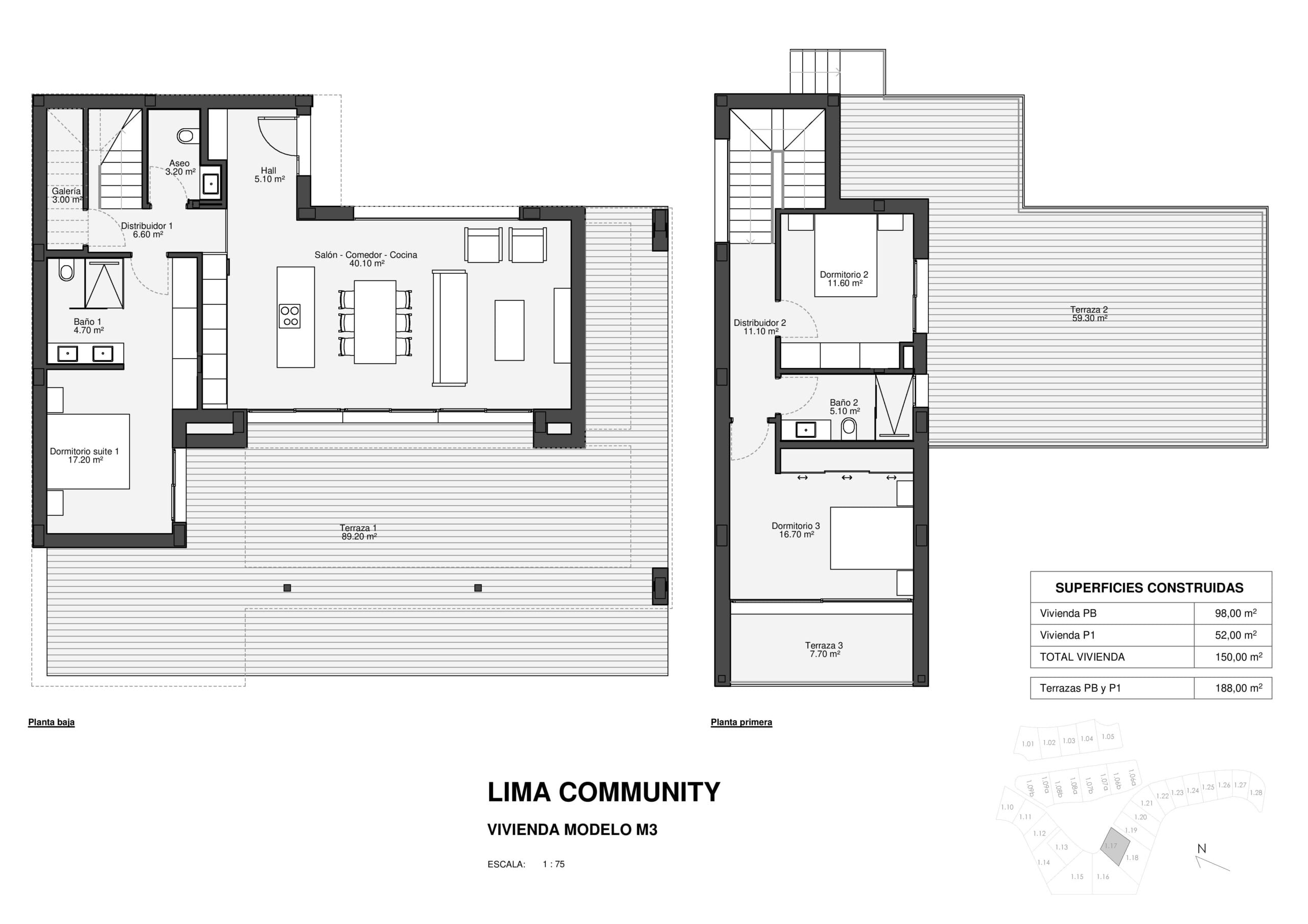 | Plot No | Villa type | Plot Size m² | Build Size m² | Terrace m² | Bed | Bath | Facing | Price € +iva |