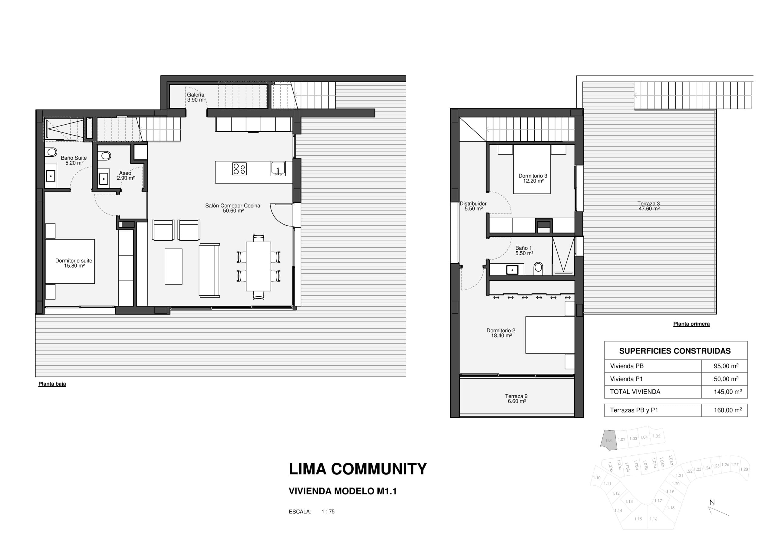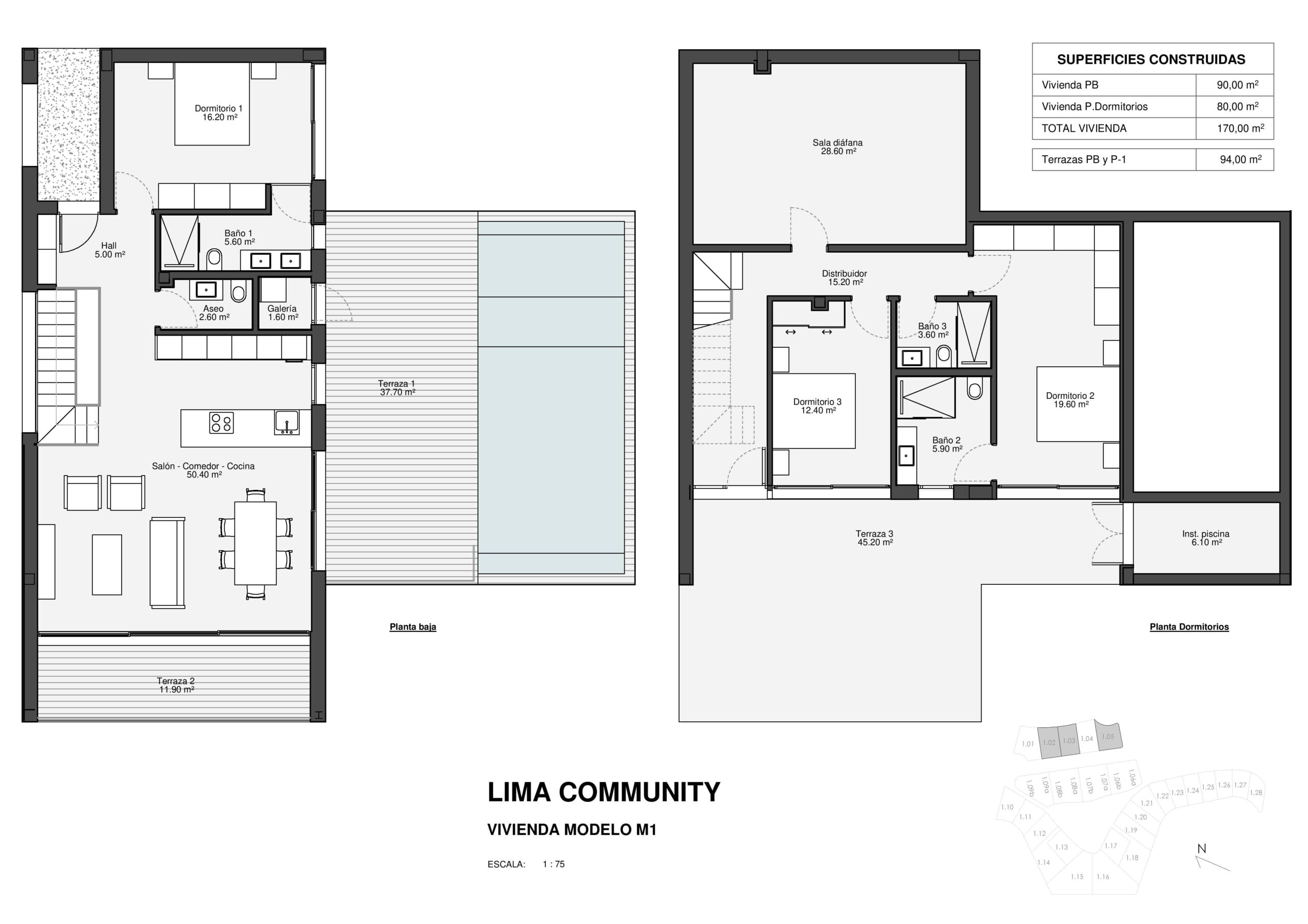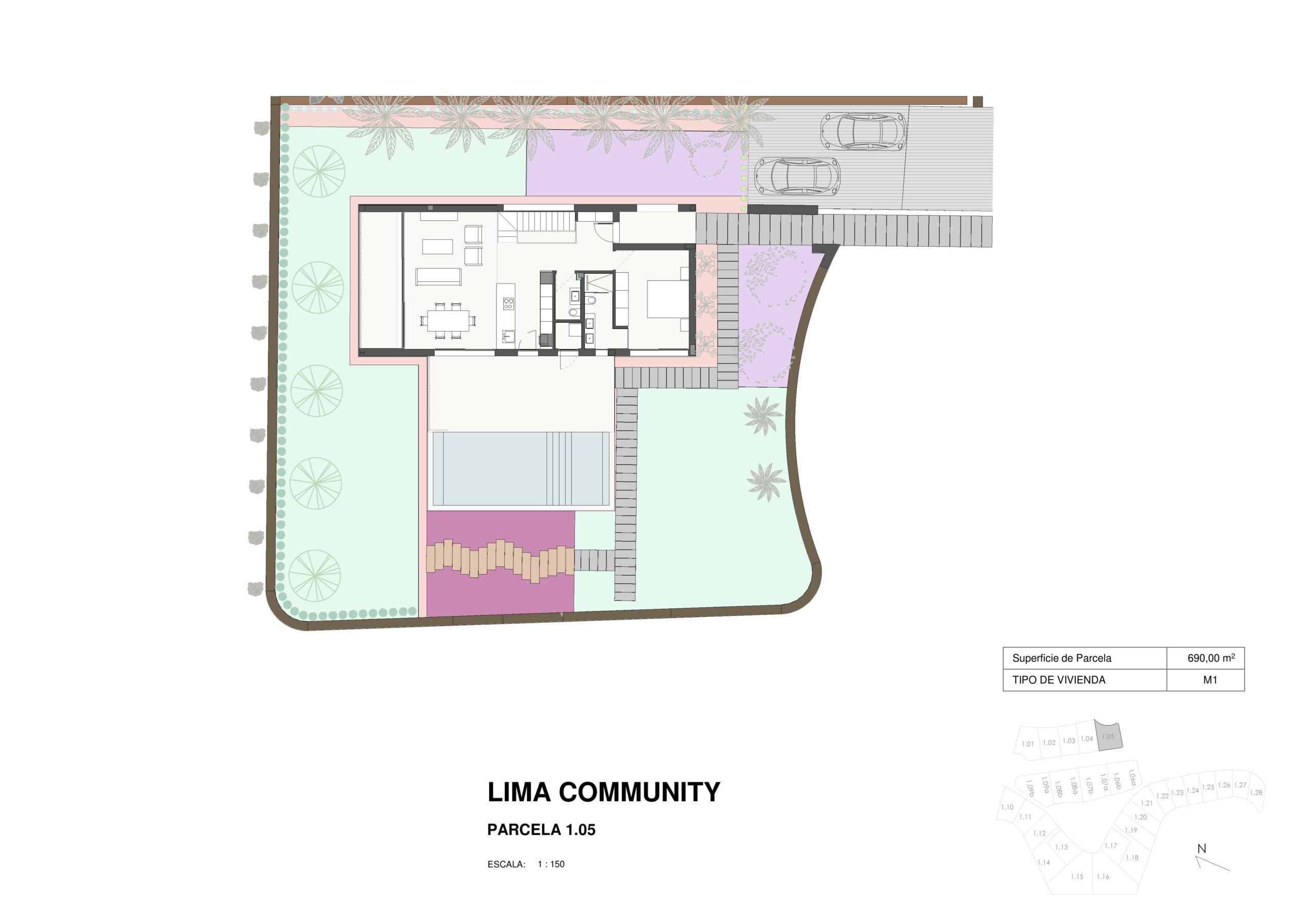 Plot NoVilla typePlot Size m²Build Size m²Terrace m²BedBathFacingPrice € +iva