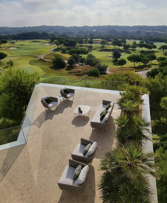 Boasting a seven metre high glass facade overlooking the surrounding area, this unique designer villa offers far reaching panoramic views over the golf course, natural woodland and sea. The impressive two-storey aquarium-style glass infinity pool also brings the outside in and the inside out. The architect has cleverly created a space that naturally connects with nature and with the local environment, providing the best views of any villa at Las Colinas.